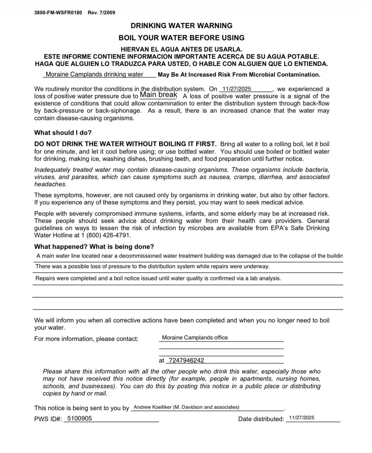 November 29, 2025Due to the water main break in the campground we are not able to be certain that there was not a complete loss of pressure in some or all of the distribution system in the campground, in an abundance of caution we are going to issue a boil notice. This boil notice will be lifted after two consecutive “passing” water samples are taken from the system and analyzed by an independent lab. These samples will be taken Monday and Tuesday (12/1-12/2) and the notice will be lifted upon confirmation of passing results from the lab Tuesday afternoon/evening at the earliest.