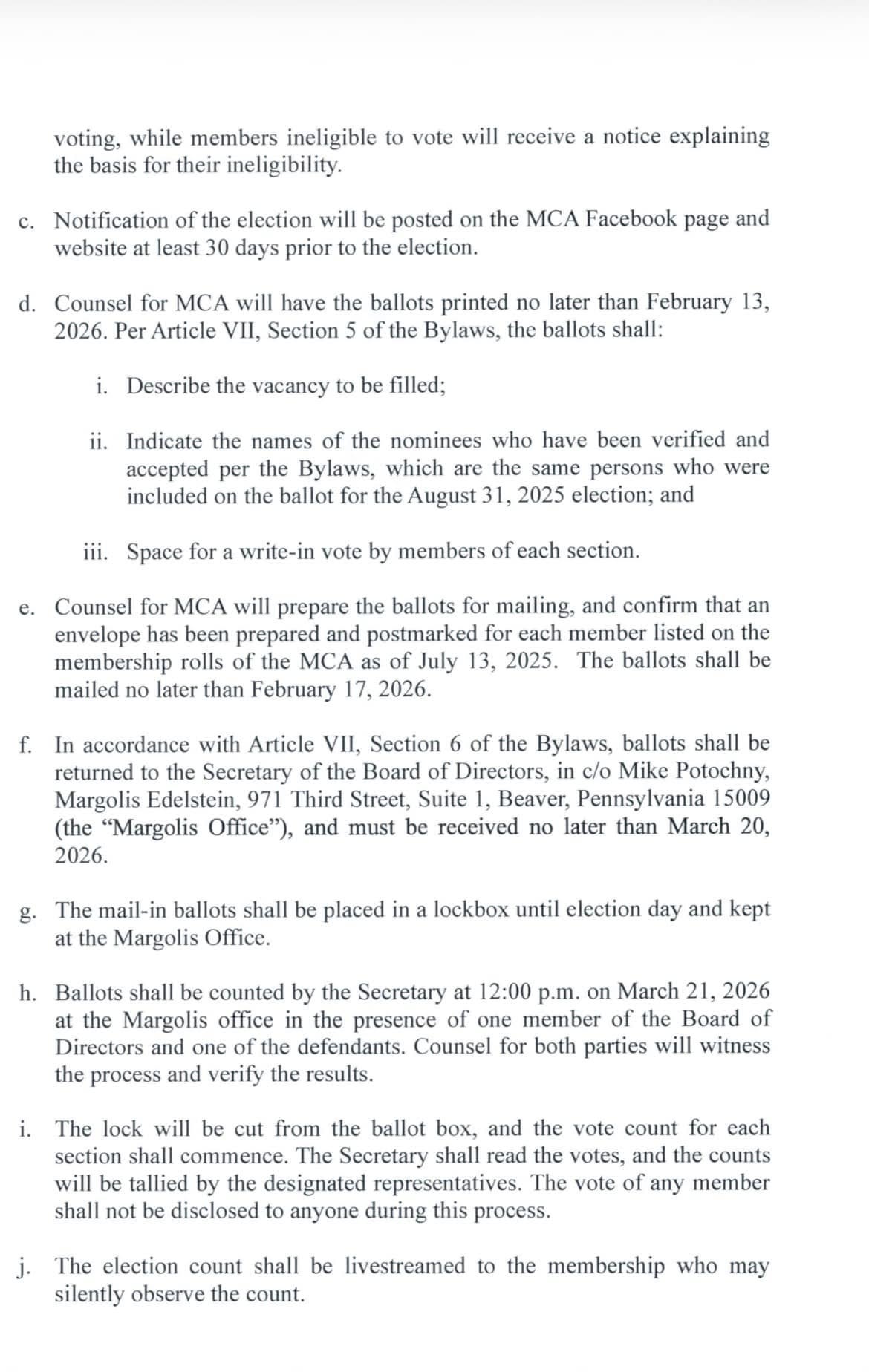 As you may be aware, litigation surrounding the MCA 2025 election has been initiated. This matter is currently before the court, and as such, the Directors may be limited in discussing specific details of the litigation. On September 25, 2025, the Court issued an Order affirming that the sitting Directors prior to the 2025 election are the valid and active Directors on the Board until any further Order of Court or the litigation is resolved.